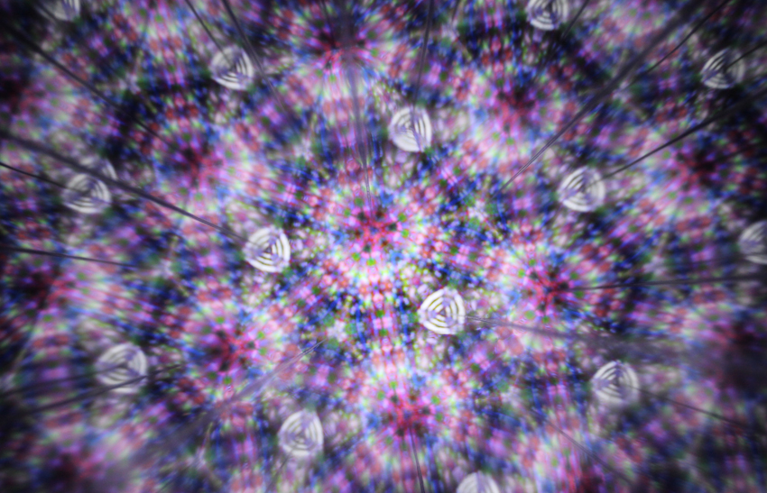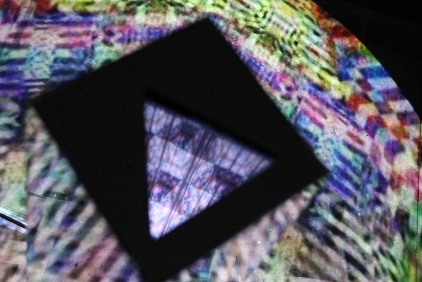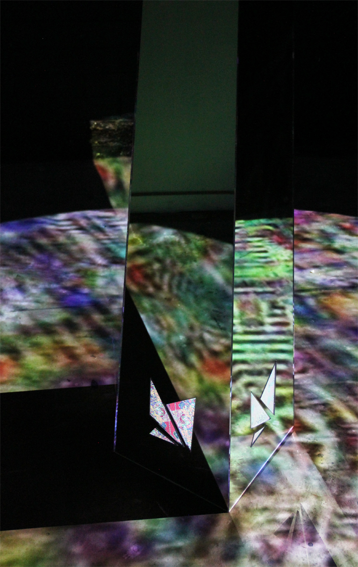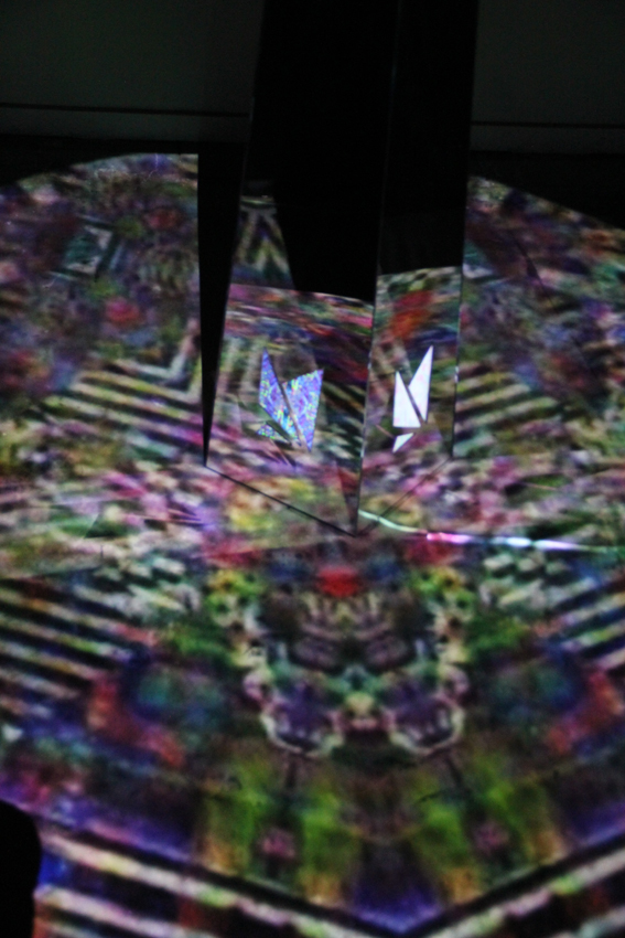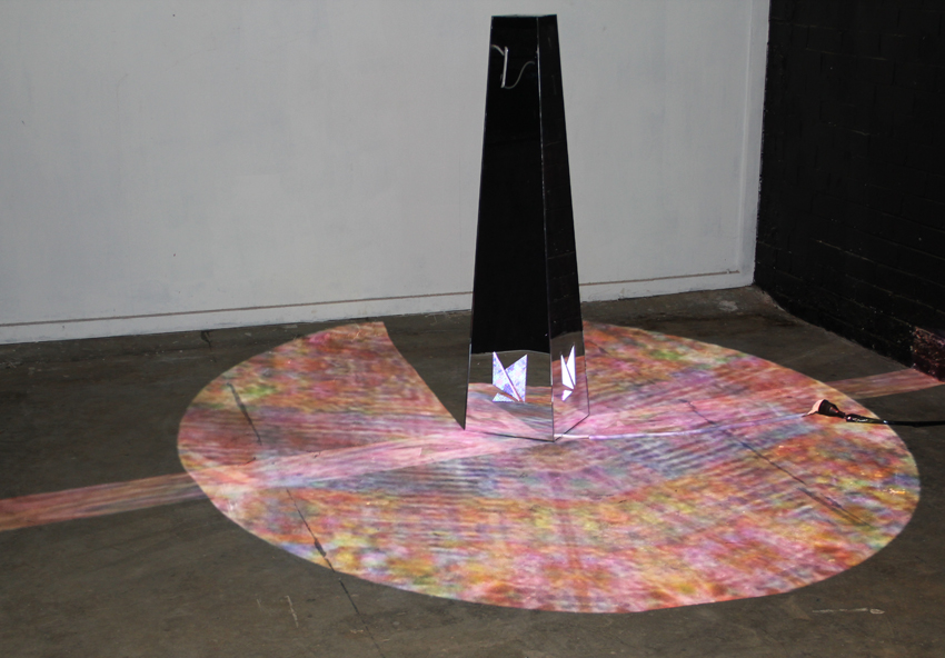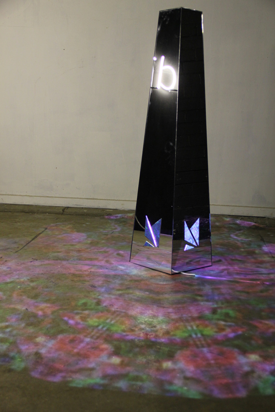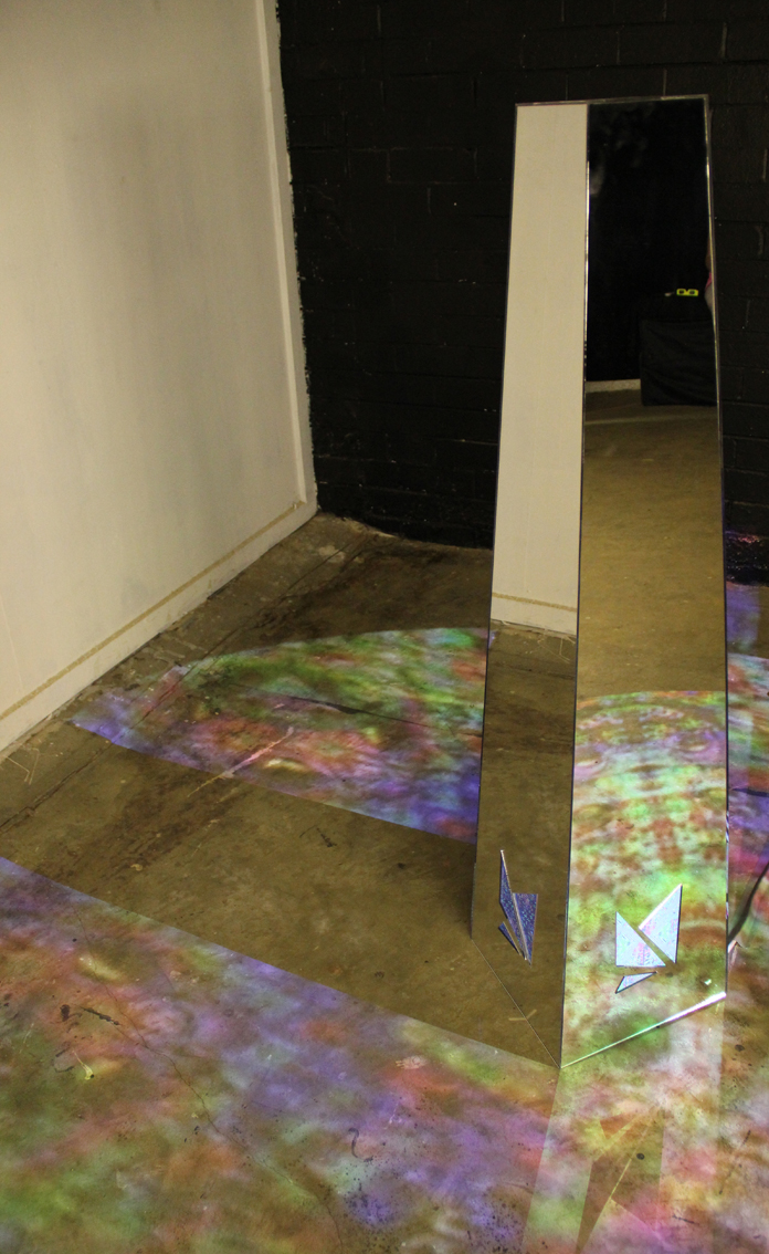this work is at the yarra sculpture gallery from March 23rd 2013 to April 14th 2013. the audience walks into a darkened room. they take a pair of diffraction grating glasses on entry, overlaying a disorienting spectrum of colour onto all sources of light in the work. a kaleidoscopic projection plays in a circle over a 1.2m tall silver acrylic totem. entitled 'meditation monument', this work has 4 small screens at its base playing similarly kaleidoscopic video. the projection reflects up onto and out of the silver mirrored surface. the audience can peer down the centre of this sculpture into a vivid, kaleidoscopic chasm. suddenly, an intense neon light shatters the meditative reverie. "what's on your mind?" the pervasive status update prompt of facebook illuminates the room, exposing the monument as something ordinary. the diffraction grating causes vivid, chaotic repetition of the update, overwhelming the audience and disrupting the moment. i made this work after my dad died at the end of 2012. after spending a year maintaining connections with people almost solely via likes on facebook and instagram, i was suddenly overwhelmed when a real and intense moment happened and i had no way of addressing it via a post. we are constantly framing and reframing every experience, ready to mediate it via an update. but i now realise the magic is in the moment - in tangible real world exchanges. this work tries to connect people to that moment, and tries to address the desire to escape into a space with no edges - a meditation monument. but it echoes my own confusion and disillusionment with that status update prompt - the mediated moment - and how inadequate any response can sometimes be.